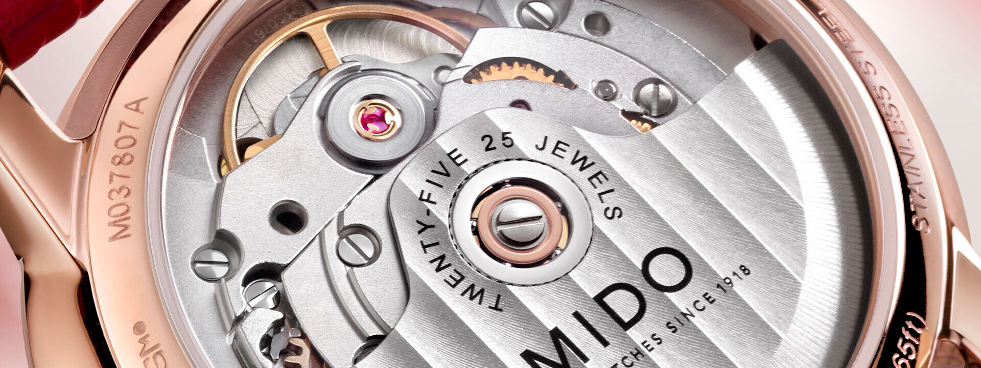If your automatic watch has a visible caseback, like the Mido Commander, you can easily see the rotor. The semicircular and movable rotor is, seen from here, the uppermost part of the movement of an automatic watch and vibrates when you set your watch in motion. By the fact that the spring wants to get back to its original, unstressed form, the actual driving force is now generated. The spring, which is made of a fine wire and spirals, is located in the so-called "spring barrel" of the automatic watch. A slipping clutch (also called a "bridge") prevents the spring from overwinding. Thus, a watch cannot be moved too much.
